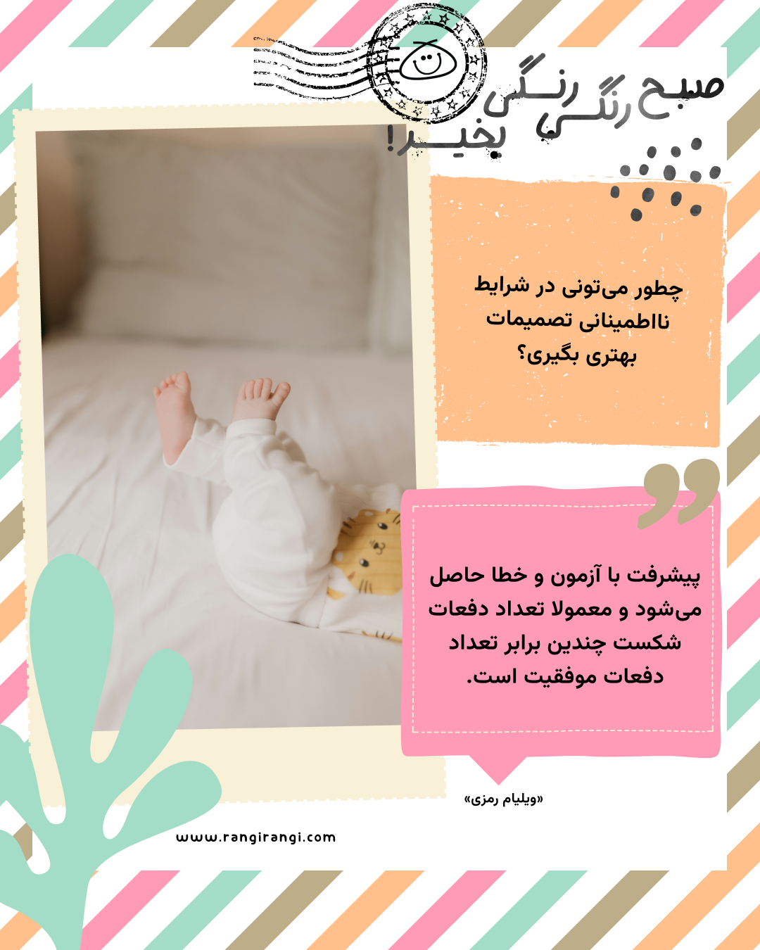 هیچکسی فردا رو ندیده؛ پس مهمه بتونیم توی شرایطی که هستیم، علی‌رغم وجود نااطمینانی و ندوونستن آینده تلاش کنیم بهترین تصمیمات رو بگیریم و انتخاب‌های خوبی داشته باشیم. درواقع هر چقدر بتونیم تحت نااطمینانی عملکرد بهتری داشته باشیم، احتمالا همونقدر موفق‌تریم. نظر شما چیه؟ توی این شرایط می‌تونین عملکرد خوبی داشته باشین یا نگرانی از آینده روی تصمیمات و عملکردتون اثر پررنگی می‌گذاره؟